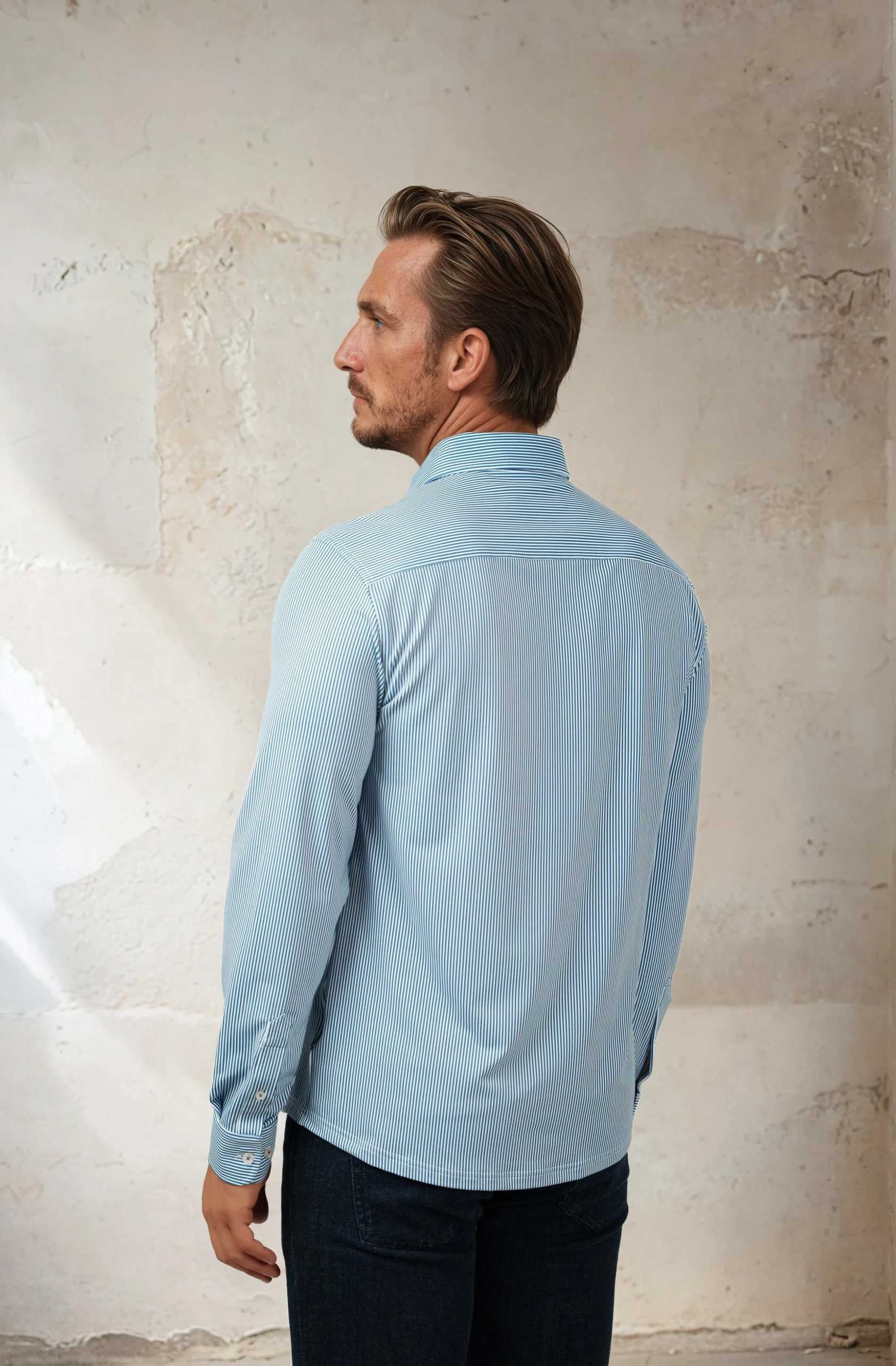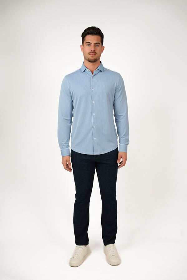 The APEX – Medium Blue Estate Microstripe Shirt from our Apex Collection features a clean, structured profile with a soft hand-feel, ideal for everyday wear and versatility across seasons.